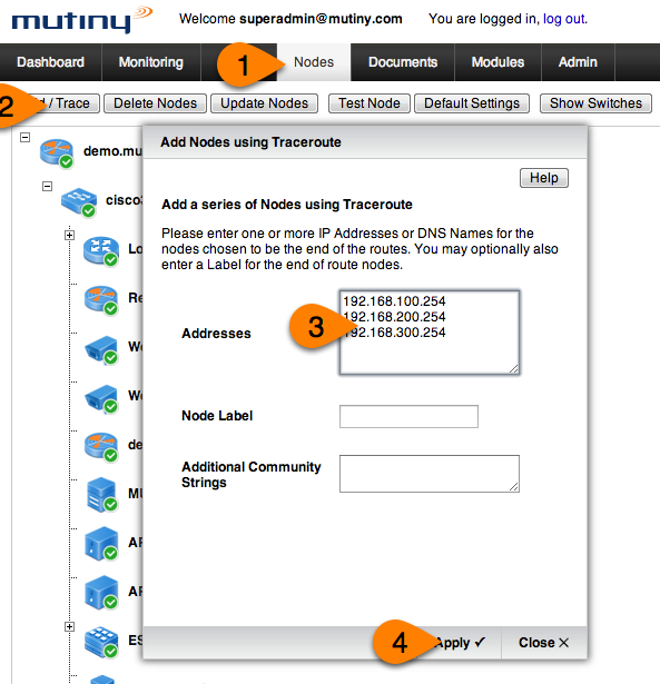 Mutiny has a quick way of adding endpoints on a distributed WAN environment, using the add with traceroute mutiny will trace and add all hops until it reaches the node, it will then repeat for each listed address until all are added. The hierarchy is displayed in the node manager.